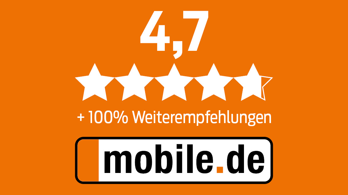 Auch auf mobile.de vertrauen uns zahlreiche Kunden und bewerten uns mit tollen 4,7 von 5 Sternen. Zusätzlich sind wir seit vielen Jahren Premium-Partner der größten Automobil-Plattform Europas.